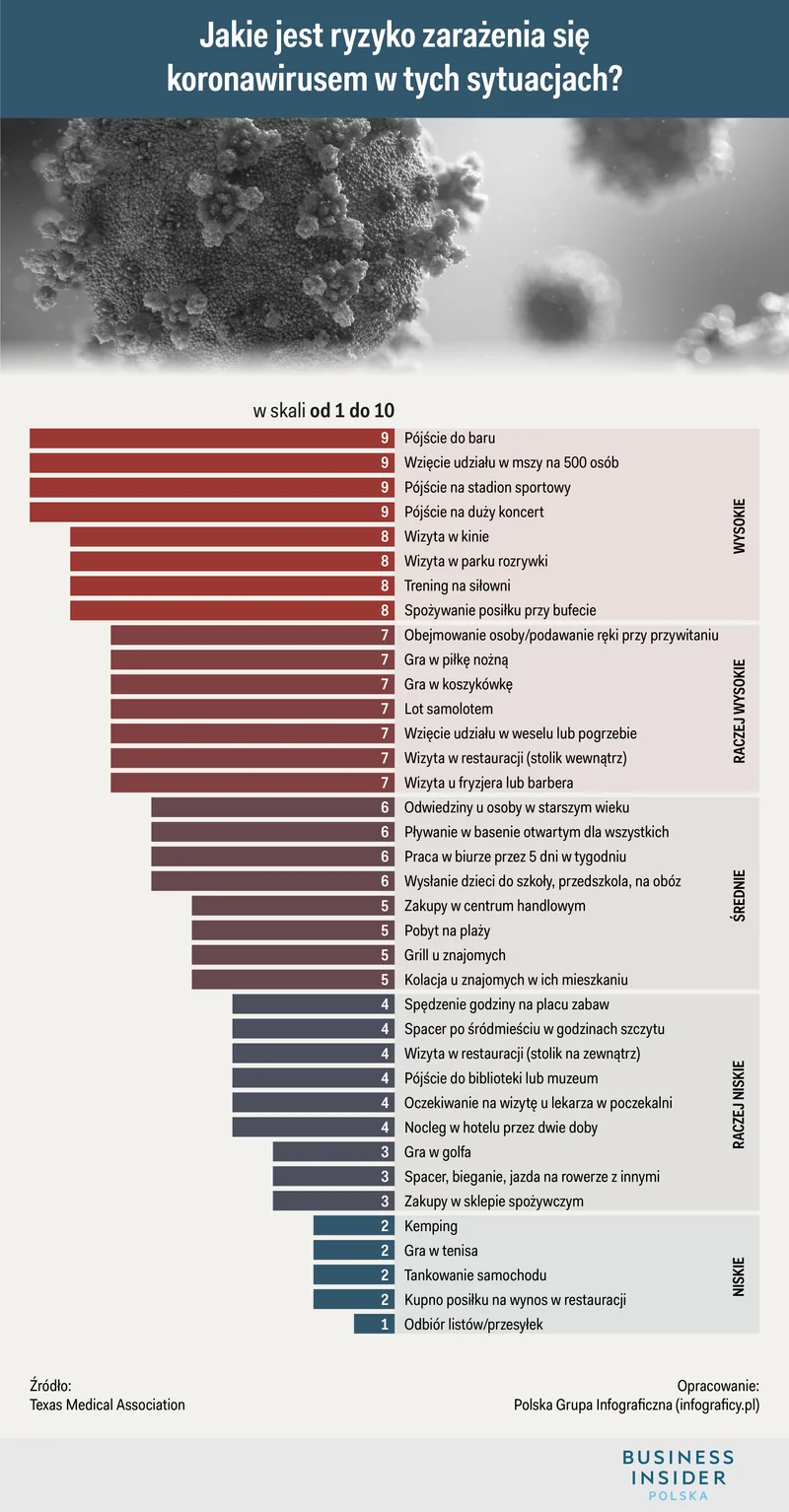 Jakie ryzyko zakażenia koronawirusem i gdzie? Opublikowano 8 grudnia 202015 lipca 2020 przez olesnicaslaska Mapka poglądowa: zr: businessinsider.com.pl/lifestyle/koronawirus-jakie-jest-ryzyko-zarazenia-sie-koronawirusem-na-grillu-czy-w-kinie/z7jqm6e
