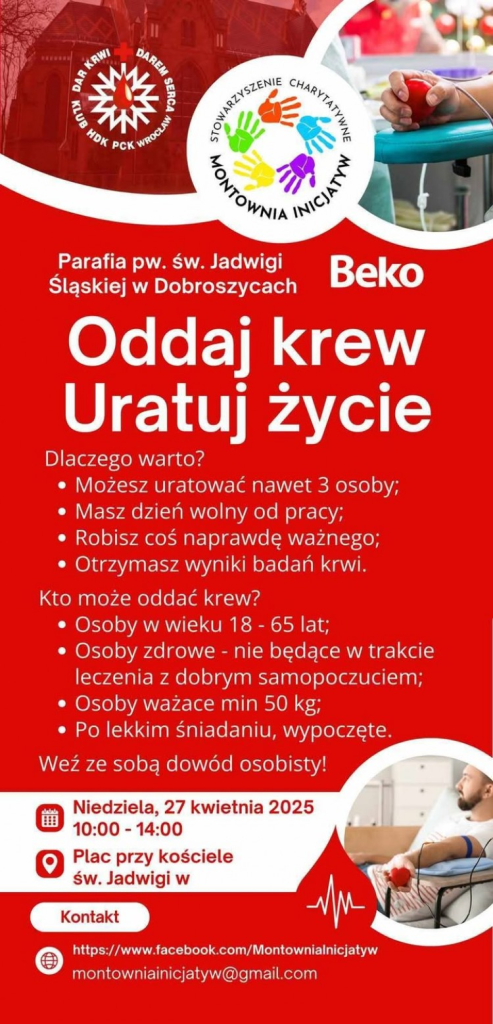 W Dobroszycach odbędzie się akcja krwiodawstwa Opublikowano 25 kwietnia 2025 przez olesnicaslaska Info poniżej: