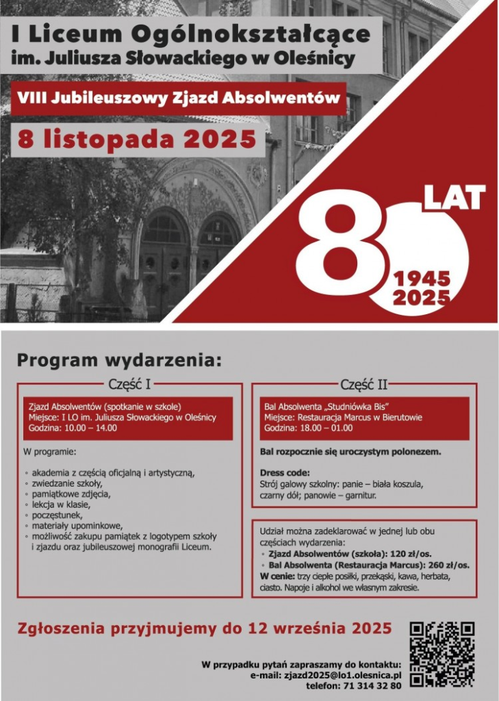 Materiały graficzne do udostępnienia znajdziecie na stronie szkoły oraz w naszych mediach społecznościowych. W razie potrzeby chętnie prześlemy je bezpośrednio – wystarczy napisać na adres: zjazd2025@lo1.olesnica.pl