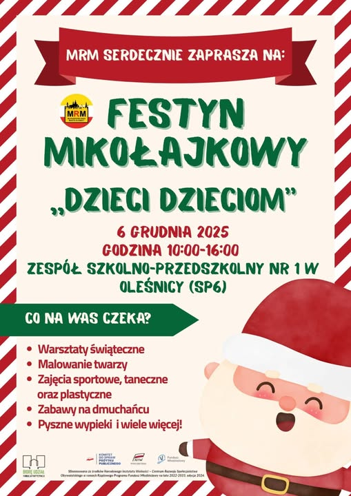 „Młodzieżowa Rada Miasta Oleśnicy zaprasza wszystkie dzieci na wyjątkową mikołajkową imprezę, która odbędzie się 6 grudnia 2025 roku w Szkole Podstawowej nr 6 w Oleśnicy, w godzinach od 10:00 do 16:00.